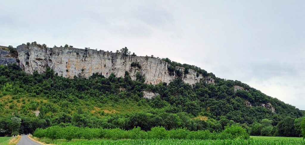 L’impressionnante falaise fait face côté nord à la plaine agricole de Meyronne et la boucle des Borgnes à Creysse. Elle s’étend également plus vers le sud où elle intègre les combes entaillant le plateau calcaire du causse de Gramat et dont les eaux de ruissellement se concentrent vers le ruisseau du Limon. Du haut de la falaise, un point de vue exceptionnel permet de découvrir, d’ouest en est, en bas, au premier plan, la Dordogne avec la pleine de Meyronne ; à l’horizon : les Rochers des Monges, Saint-Sozy et Meyronne, le Mont Mercou, le Causse de Martel, le Cirque de Montvalent et le Puy d’Issolud.