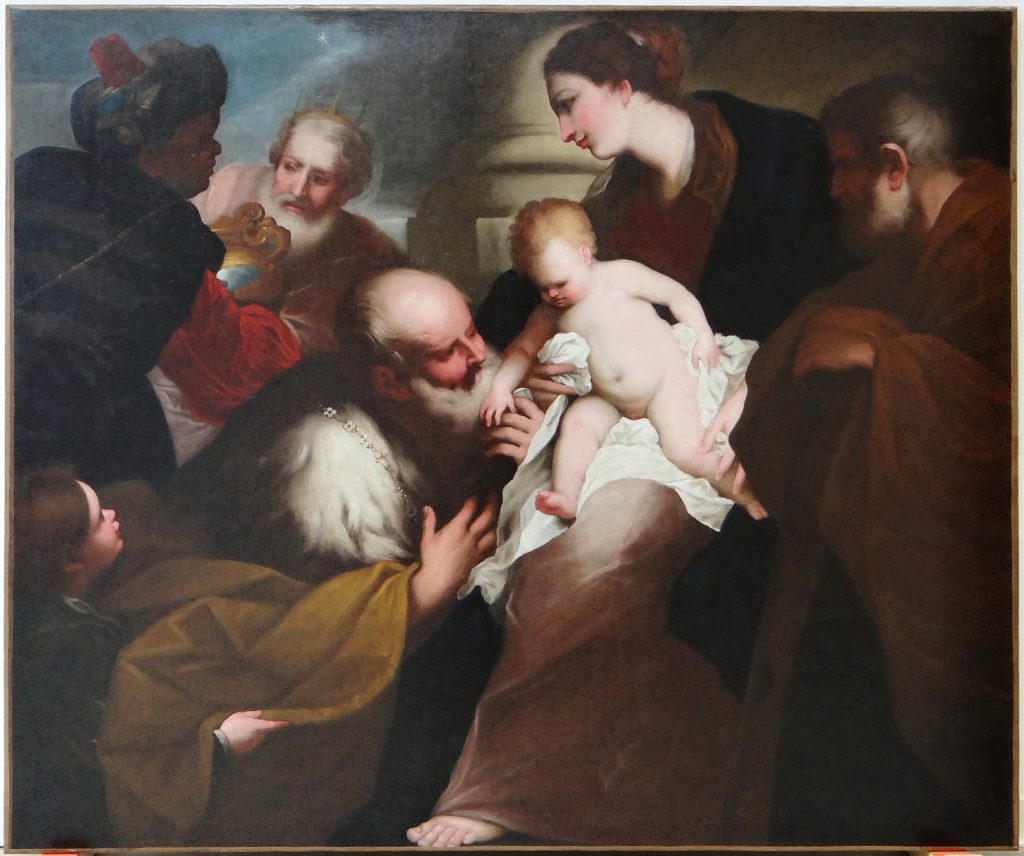 Le tableau représente une Adoration des mages. Au centre de la composition, marqué par la base d’une colonne de pierre à l’antique en arrière-plan, la Vierge de profil présente sur ses genoux l’Enfant Jésus sur un linge blanc. L’Enfant est penché vers l’un des trois rois, agenouillé devant lui, richement vêtu d’un manteau d’hermine. Un petit page à moitié hors du cadre contemple la scène en soutenant le vêtement de son maître. À l’arrière-plan, à gauche, on aperçoit deux rois portant un vase précieux. L’un des deux se tient de dos, dans l’ombre, vêtu d’un costume rayé ocre et noir à manches bouffantes rouges et d’un turban. Son visage de profil est à peine discernable. Il semble s’agir de Balthazar, le roi à la peau noire. Face à lui, le deuxième roi paraît plus âgé. Barbu et couronné, son visage en pleine lumière se détache sur un fond de ciel nuageux où brille l’étoile de Bethléem. Au premier plan à droite, dans l’ombre, Joseph est figuré sous les traits d’un homme barbu appuyé sur un bâton, contemplant la scène. La composition est structurée autour d’une diagonale forte mettant en scène la Vierge, l’Enfant Jésus et le roi le plus âgé, animée par des jeux d’ombre et de lumière mettant essentiellement en valeur le visage de la vierge, l’Enfant et le visage du roi mage agenouillé.